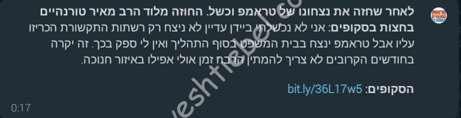 איך לאך פון אלע קול מבשר צוהערער... פון אלע טורנהיים גלייבער, און פון אלע אפציעלע נייעס קאמפאניס. טראמפ איז א זיכערער געווינער! ממה נפשך, אויב איז די בית משפט לויט'ן געזעץ, איז נישטא קיין עוולה אינעם משפט. און טאמער ווערט ביידן געווינער, איז נישטא קיין לאנד! הערט גוט וואס איך זאג. מ'דארף דאס נישט גלייבן פון טורנהיים, צו הערן פון מידיע, ס'דא א קעסטעלע העכערן האלדז, וואס הייסט מוח וואס האט שכל! דאס איז די נארמאלע שכל, אז א שווינדל איז פסול, און די פאלק האט דאס ווארט, ווען ס'איז א מציאות אז די פאלק געהערט פאר טראמפ, ווען די אלע מויל מאכער און סטאנציאנען קענען נאר מאכן הויעכע גערודער גארנישט מער. טורנהיים זאל נוצן זיין חומש'ל ווען ער בעקט ארויס מיט זיין אוטא... און קול מבשר זאל ווייטער מעלדן חזרות ופרעפלערייען בשם אמרו - די מעינ-סטרים מידיע, און מיר וועלן טאנצן חסל סידור פסח אין גאר א קורצע צייט. האלט אייך געשפאנט!