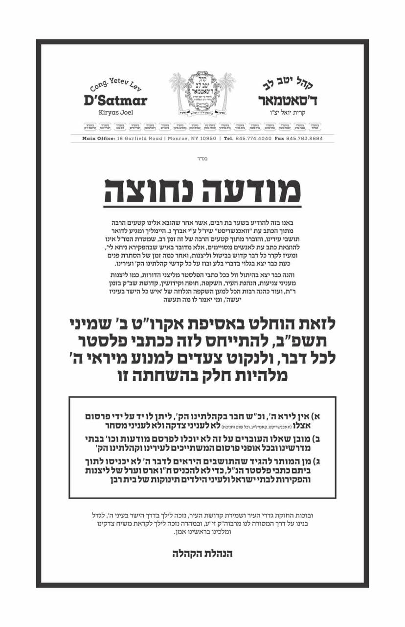 מאנטאג שמיני איז פארגעקומען ביי אונז אין קרית יואל א קהל׳ס מיטונג איבער די לאנגיעריגע פאשקעוויל וואכנשריפט, דאס אז ער איז אריבער יעדע ליניע, בעסער געזאגט ער האט נישט קיין ליניע, דאס דארף ווערן אפגעשטעלט.
