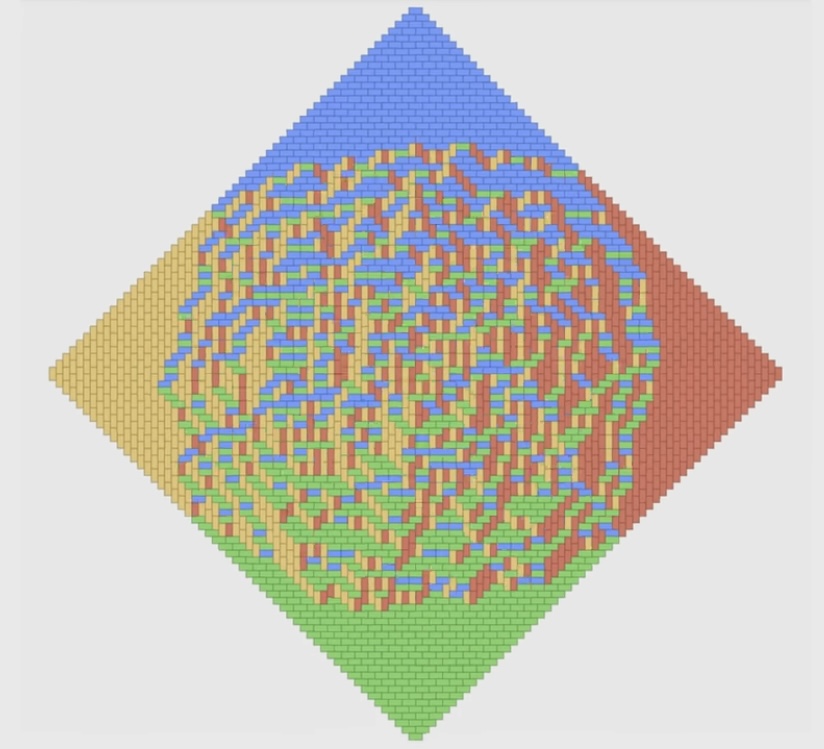 אין דאס אלעס איז דא די געדאנק פון אַן עזטעק דימאנט. דאס איז ווען איך הייב אָן מיט א שאך-ברעט פון 4x4 קעסטעלעך און דערנאך לייג איך ארום דעם קעסטעלעך און איך שנייד אוועק די 4 קעסטעלעך פון די עקן. איינמאל איך האב דאס לייג איך פשוט יעצט ארום איר גבול נאך קעסטעלעך און נאר וואו עס זענען דא קעסטעלעך. אזוי ווערט עס א דימאנט שׁעיפּ. וויפיל מאל איך טוה דעם פראצעדור פון ארומלייגן ארום איר קעסטעלעך און מאכן גרעסער, דאס איז איר אָרדער (די ערשטע איז ווען עס איז א פשוט׳ע 4x4). דאס איז עס ביים פערטן מאל/אָרדער: די עזטעק דימאנט טעארעם לויטעט אז די צאל דאַמינוֺי טיילינגס וואס מ׳קען מאכן דערויף איז 2 געהעכערט צום עקספּאָנענט פון האלב די אָרדער פונעם דימאנט טיימס איינס העכער די אָרדער. עס איז אויך דא דערין די אַרקטיק סירקעל טעארעם וואס לויטעט אז לפי די 4 וועגן הנ״ל א דאַמינוֺי קען טיילן א שאך-ברעט, ווען מען טיילט די דימאנט מיט דאַמינוֺיס ביי רענדאם וועלן די דרויסענדע 4 עקן פונעם דימאנט אלס ווערן ״אריינגעפרוירן״ מיט יעדעס איינע אַן אנדערע פון די 4 וועגן פון טיילינגס (און איך קאליר יעדעס סארט וועג אַן אנדערע קאליר), און אינדערמיט וועט אויסזעהן בערך ווי א סירקעל. ווי העכער די אָרדער פונעם דימאנט ווערט, אלס מער וועט די אינדערמיט אויסזעהן ווי א סירקעל. כזה: די צאל וועגן ווי אזוי צו טיילן דעם דימאנט איז 2 צו די פּאַוּער פון די אָרדער וואס עס איז.