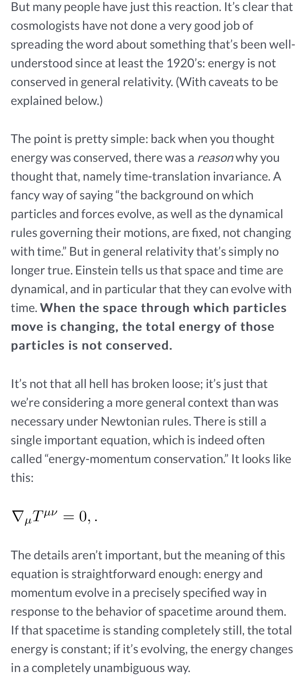 דר. שׁאַן קעראל שרייבט: דא איז ער מסביר אז ענערגיע ווערט אויך נישט געזעהן צו זיין קאַנסערווד אין קוואנטום מעכאניקס.מי אני האט געשריבן: ↑דאנערשטאג יוני 01, 2023 6:34 pm דא זאגט דער פיזיקער דר. דניאל ווייטסאן אז די עקספּענשאן פונעם יוּניווערס, וואס דאס ברענגט מער טונקעלע ענערגיע (וואס טוהט ווייטער שטופן די עקספּענשאן, וחוזר חלילה) און טוהט דאדורך אויך רעדשיפטן פאטאנס וממילא פארלירן זיי ענערגיע (אויף אסאך א קלענערן פארנעם), באדייט אז קאַנסערוועישאן פון ענערגיע האלט נישט. ער זאגט אז דאס איז מכח דעם אז די עקספּענשאן פון די יוּניווערס טוהט טאקע צוברעכן דעם סימעטרי פון ספּעיסטיים אין וועלכעס די קאַנסערוועישאן פון ענערגיע איז אָנגעוואנדן.
