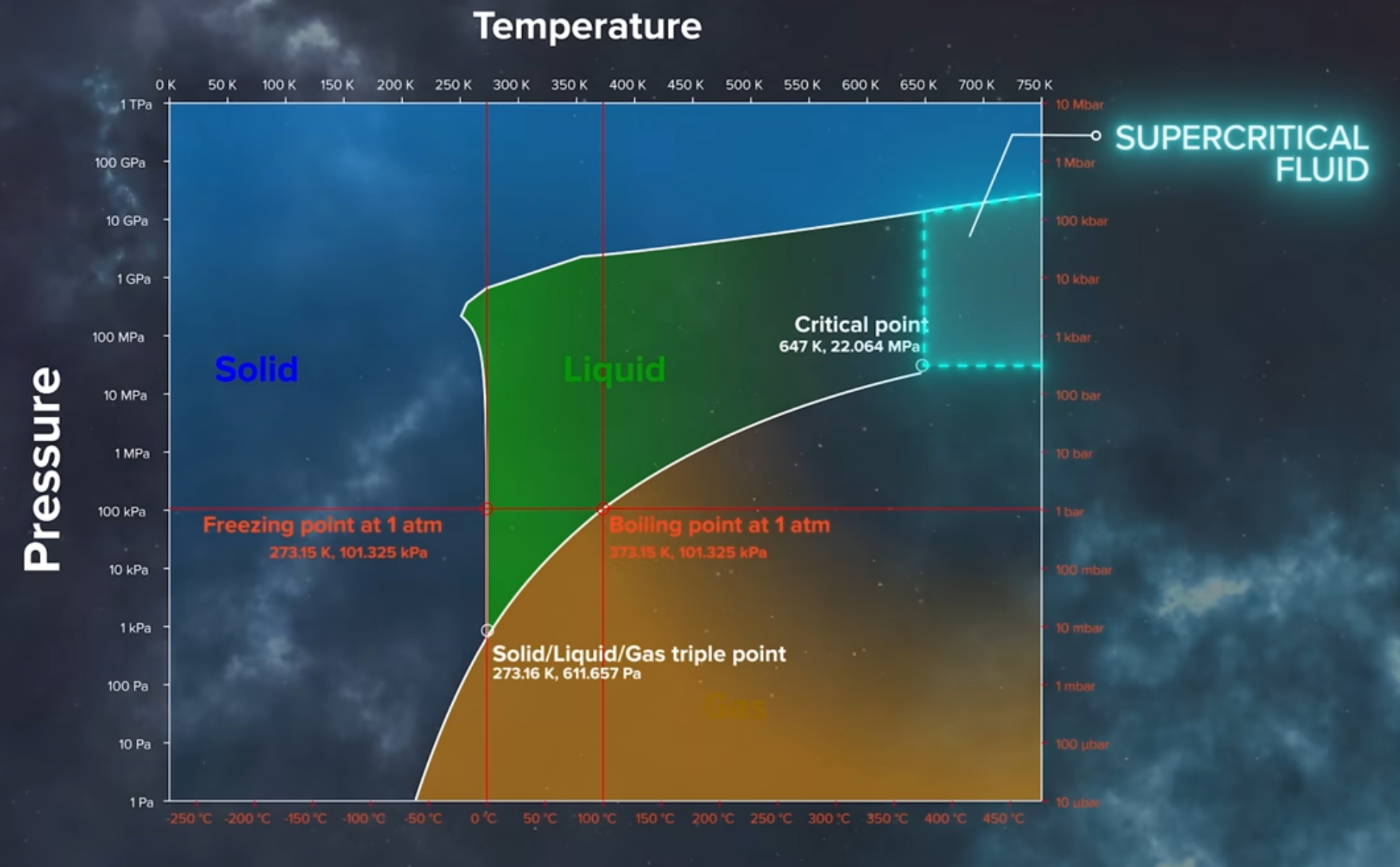 אבער חוץ מזה וואס יעדעס מאטעריאל האט אירע אייגענע פונקטן וואו זי טוישט זיך פון א סאליד צו ליקוויד צו גאז, ווענדט זיך עס אויך אין די פּרעשור. לדוגמא, וואו עס איז דא ווייניגער פּרעשור, פעהלט אויס ווייניגער טעמפּעראטור צו ארויפגיין א פעיז. לזה איז דא א פעיז דייאגראם וועלכע צייגט ווי אזוי די ביידע וועריעבּלס זענען פועל אויף א חומר. דאס איז א פעיז דייאגראם פאר וואסער: די קריטישע פונקט איז וואו עס איז אי אפשר לעמוד עליו צי עס איז א ליקוויד צי א גאז; וואו עס איז א סוּפּערקריטיקעל פלואיד.