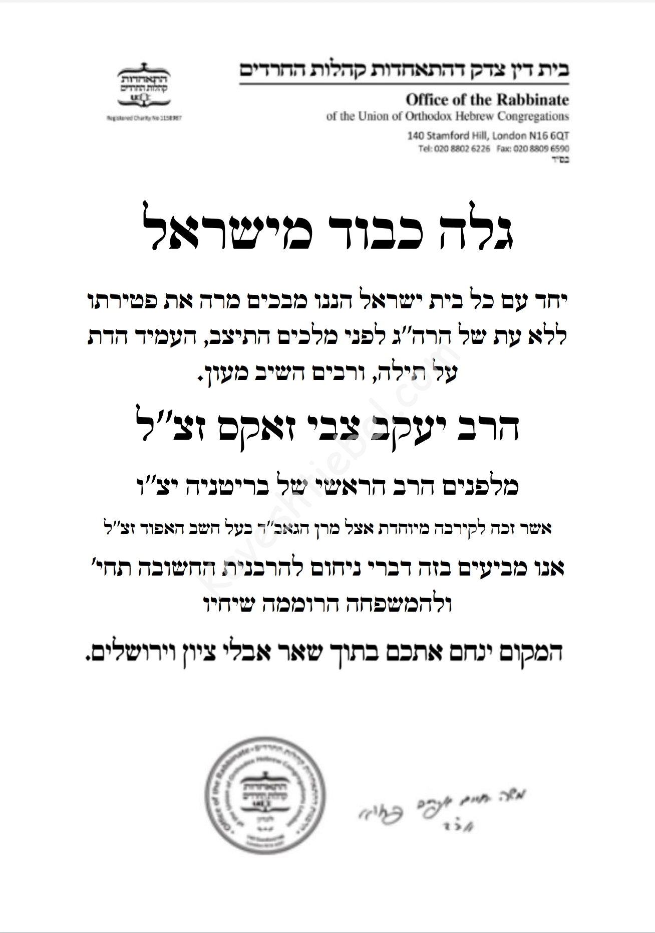 דער בריוו איז שקר וכזב מכמה טעמים, דער עיקר וואס מ'זעהט איז דער חתימה - דער גאב"ד חתמ'ט שוין לאנג נישט אויף קיין צעטיל בעווה"ר.