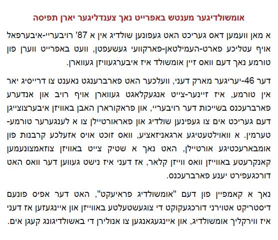 מען ווייסט נאך נישט אלע פרטים. אבער לויט די אינפארמאציע וואס איז לעת עתה דא אויפן גאס, איז עס א פחד נורא וואס א מענטש קען אויסשטיין על לא דבר.