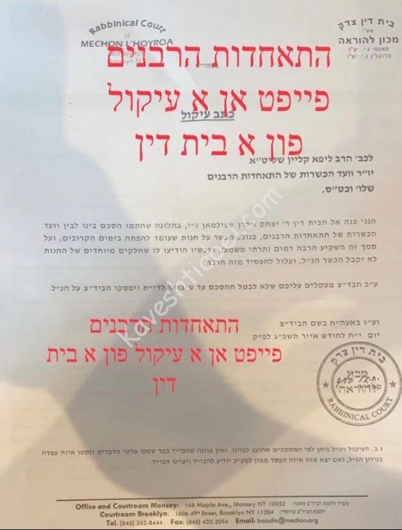 2. בי"ד נעמט אראפ די עיקול, על סמך א טענה פון א דריטע צד, וואס טענה'ט אז די השגחה פון התאחדות מאכט זייט שאדן. נו, זאלן זיי רופן התאחדות צו דין תורה.