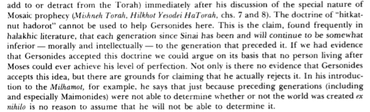 ס׳איז אינטרעסאנט צו באמערקן אז דער רלב״ג אין מלחמות ה׳ (מאמר ו ח״א פט״ו) וויל ברענגען א ראיה קעגן קדמות העולם פון דעם וואס מיר זעהן ווי חכמה ווערט נשלם באורך הזמן. און אויב איז דאס צייט און מענטשהייט אלס געווען איז דאך וויבאלד טבע האדם והשתוקקותו לקנות חכמה וואלט מען שוין געדארפט ווען האלטן מער. ער ברענגט אן ענליכע ראיה פון שפראכן אז דאס איז הסכמי דורך מענטשן ולא טבעי. וממילא מוז זיין אז שפראכן האבן זיך אנגעהויבן און זענען מחודש דורך דאס מין האדם הקודמו וואס אן דעם קען ער נישט אנגיין. איז דאס א ראיה דערצו אז די מין האדם וואס איז געווען קודמו מיט א פיניט זמן איז אליין מחודש געווארן א פיניט זמן פאר דעם ע״ש.