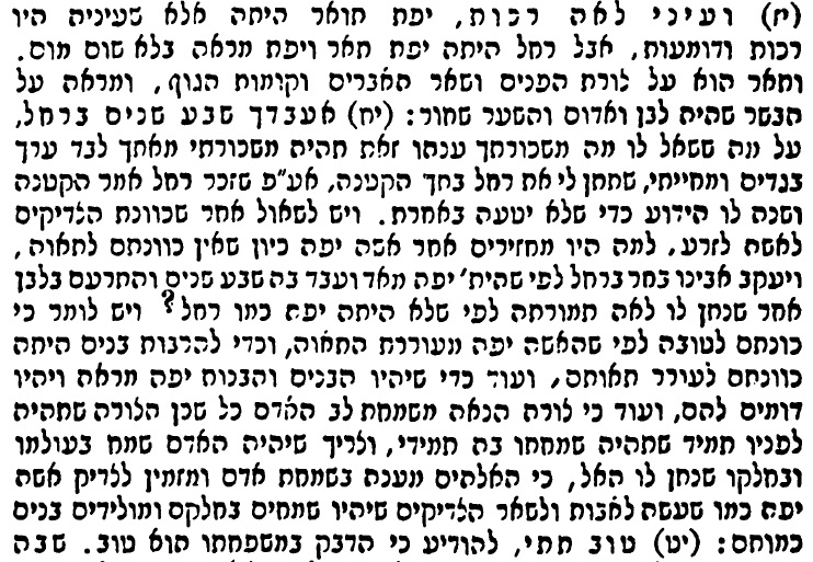וישק יעקב לרחל – ראיתי את העם הזה כמתאוננים על יעקב שעשה זה הפריצות, ובפרט החסידים מֵעַמֵנוּ והזקנים. ואם חי ה׳ איני מצטער על מקרא זה אבל אומר עם זה שאין מנהג הארץ לנשוק בפה או בלחי, וחלילה לו ולנו שיהיה זה בפה רחמנא ליצלן. ואם חס ושלום עשה זה יעקב מה נוכל לעשות, ויותר חזק מזה עשה משיח אלוקי יעקב. והרבה עמו פדות (תהלים קל ז) ית׳ וית׳.