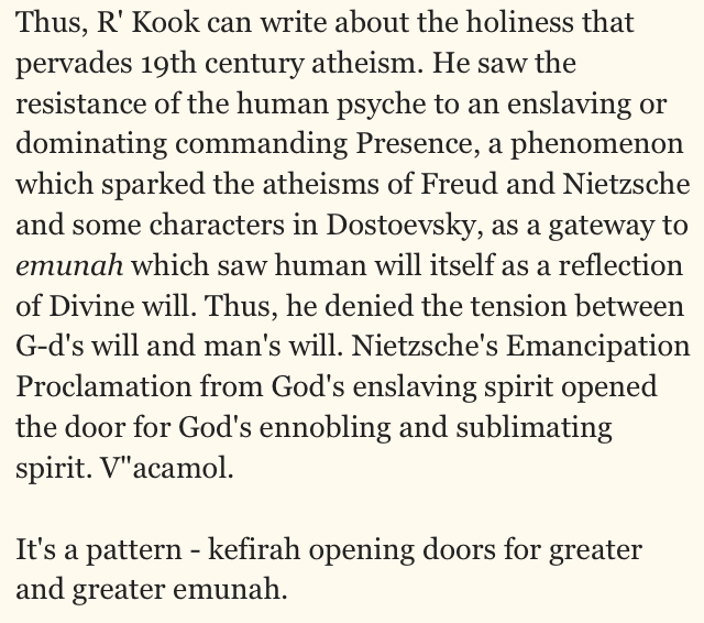מי אני האט געשריבן:קען מען בדרך אפשר גמור זאגן אז די צווייטע סארט כפירה וואס הרב קוק זצ״ל דערמאנט, די כפירה ישראלית וואס קומט מחמת תשוקה לרוחניות, איז מקושר צו די צווייטע סארט כפירה וואס דער ליקוטי מוהר״ן דערמאנט וואס קומט פונ׳ם חלל הפנוי, וואס פון דארט פעהלט רוחניות, וממילא וויל די נשמה פונ׳ם איד דאס אנפולן (כעין הצדיק וואס קען זיך יא ספראווען דערמיט) ובא לכפירה וואס אויף דעם קען מען נישט (געהעריג) ענטפערן.