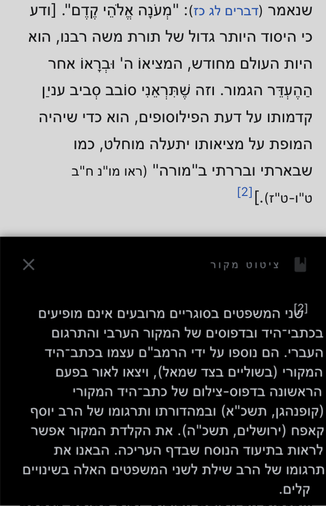 עובדיה האט געשריבן:באמת האט דער רמב"ם אויך געהאלטען אז בריאת יש מאין איז פון די עקרי הדת, ווי מ'זעהט אז ער רעכענט עס אפ' פון די יג' עיקרים, און פון די חמשה הנקראים מינים, נאכדעם וואס ס'איז נישט דא קיין הכרח משנה צו זיין פון די פשטות הפסוקים. די זעלבע שרייבט ער בנוגע תחיית המתים, אז מוואלט ווען געקענט מפרש זיין די פסוקים דלא כפשוטן, נאר ס'פעהלט נישט אויס, און דאך רעכענט ער עס למעשה פון די יג' עיקרים.
