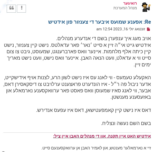 שפילער: ייש"כ. דו האסט מיר געסעיווט די טרחה. וויל איך האב שוין געהאלטן ביי מיך איינשרייבן. נאר איך בין א געפערליכער ציוני. איך האלט אז דער אייבישטער האט מער ליעב די אידן. אפילו די נישט אזוי שטארק ערליכע. מער ווי די אראבערס. אויך ביניך א (שטיקל) ארוני. און איך האלט אז מהר"א איז נישט דער גרעסטער שייגעץ און טעראריסט וואס איז פארהאן. נאר אן ערליכער, קלוגער אדמו"ר און מרא דאתרא וועלכער פיהרט זיין קהילה על דרך התורה וחסידות. אז דו ווילסט קענמען איהם אנרופן א מנהיג ישראל. איינער פון די גרעסטע רעבעס אין דעם היינטיגן דור...!שפילער האט געשריבן:סהאט זיך געפענט א ניייע וועבזייטל מיטן נאמען איד טיש , וואס דער ציל מיטן זייטל האב איך נישט קיין אהנונג אפשר האט עס קאנעקשאן מיט קול מבשר ווייל זייער הויפט זייט איז דא נייעס מיט לינקס צו קול מבשר.