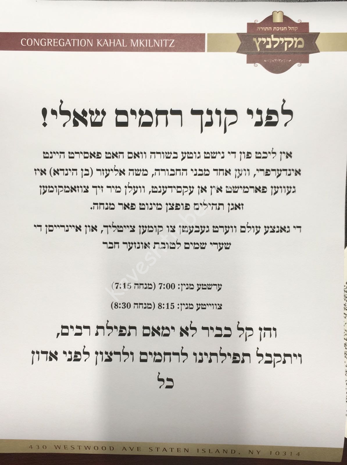 איך עפען דעם אשכול ווי מ'וועט קענען מעלדן פאר'ן ציבור מתפלל צו זיין ווען ס'מאכט זיך חלילה אן עת צרה. ויה"ר שלא ישמע עוד שוד ושבר בגבילנו ונשמע ונתבשר בשורות טובות.