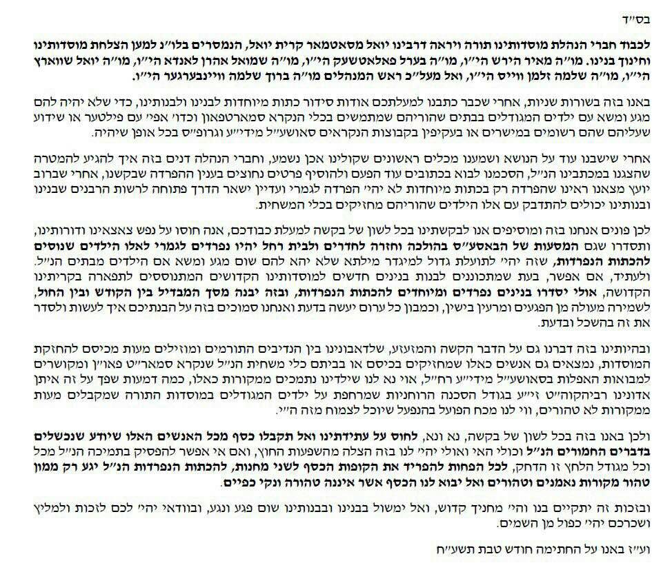 היינט פארמיטאג איז געווען א פארזעצונג-אסיפה אין כולל, איבער די ענין פון אפגעטיילטע קלאסן פאר קינדער פון שטובער מיט סמארט פאונס, עס איז געבליבן זיך צו ווענדן צו די הנהלה מיט אן הוספה צו די בקשה, אז אויף די באסעס אויף וועלכע די קינדער פארן טעגליך, זאל מען ארבייטן צו האבן באזונדערע באסעס פאר די קינדער פון די הייליגע שטובער.