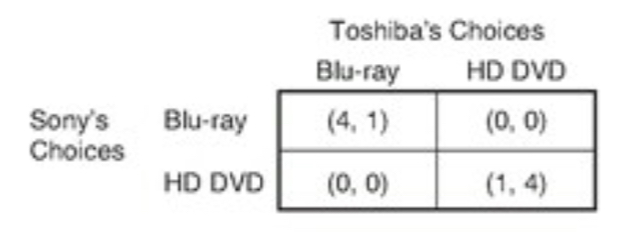 למשל, דא הא׳מיר א משל פון צוויי קאָמפּאַניס וואס ווילן זייער DVD פּלעיערס צו א געוואוסע פארמאט. יעדע קאמפּאני וויל ענדערשער זייער טעכנאלאגיע, וואס דעמאלטס אויב די אנדערע קאמפּאני נעמט דאס אויך אן, פארדינען זיי א יוטיליטי פון 4 און די צד שכנגד א יוטיליטי פון 1. אויב אבער זיי זענען זיך נישט משווה און יעדער נעמט אן דאס וואס ער וויל, פארדינען זיי ביידע 0, גארנישט.