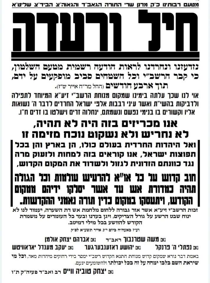 סדנא דארעא חד הוא, די חרידישע מהלך המחשבה איז איבעראל דער זעלבע. אין א שמועס מיט די ביילאגע אין די וואך - די צייטשריפט, פארציילט דער מירון מאכער רב יואב אברהם הי"ו אז די מדינה מאכט גאר גרויסע פראבלעמען אין מירון. בתוך הדברים דערקלערט ער בילד אז טאמער וועט די מדינה גייט טאקע אוועק נעמען די שטחים וואס באלאנגט יעצט פאר די הקדשות איז עס א גאר ערענסטע פראבלעם. פארוואס? ווייל דעמאלס גייט די צדיק זיין נקבר אין קרקע שאינו שלו. דער רב יואב בלאבעלט ארויס מיט חוצפה אז טאמער דאס געשעט לויט געוויסע פוסקים גייט מען דארפן מפנה זיין די קבר פון רשב"י.