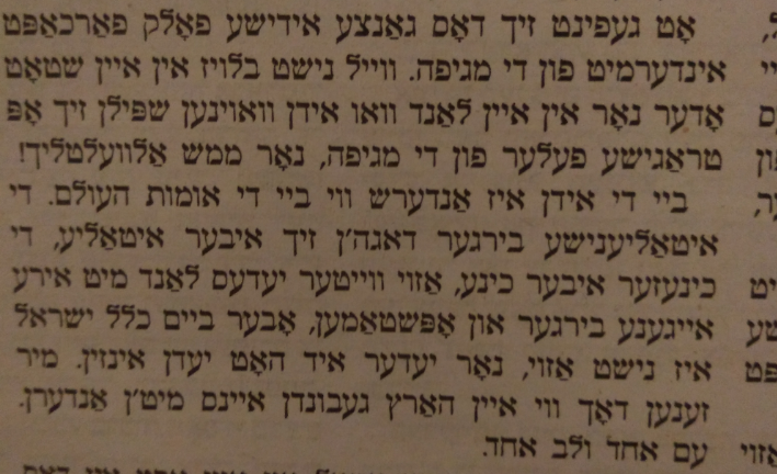 ביי אונז אבער האט מען געלאכט. די גוים מאכן צו די שולעס? פארוואס דארפן זיי שולעס בכלל? וואס טוען זיי דען דארט, פארברעכן און שמוץ. זיי רופן אפ זייערע פארזאמלונגען? עס איז דאך ממילא נארישקייטן, סתם פארוויילונגען און שטותים, מיר דארפן דאך דאווענען! דאס איז דאך באמת וויכטיג! נישט ווי די גוים וואס זייערע זאכן זענען קיינמאל נישט וויכטיג בכלל. מיר דארפן זען צו פארהאנדלען מיט די רעגירונג וויאזוי צו מעגן בלייבן אפן. כ'מיין, יעדער פארשטייט, דאס איז דאך "באמת" וויכטיג.