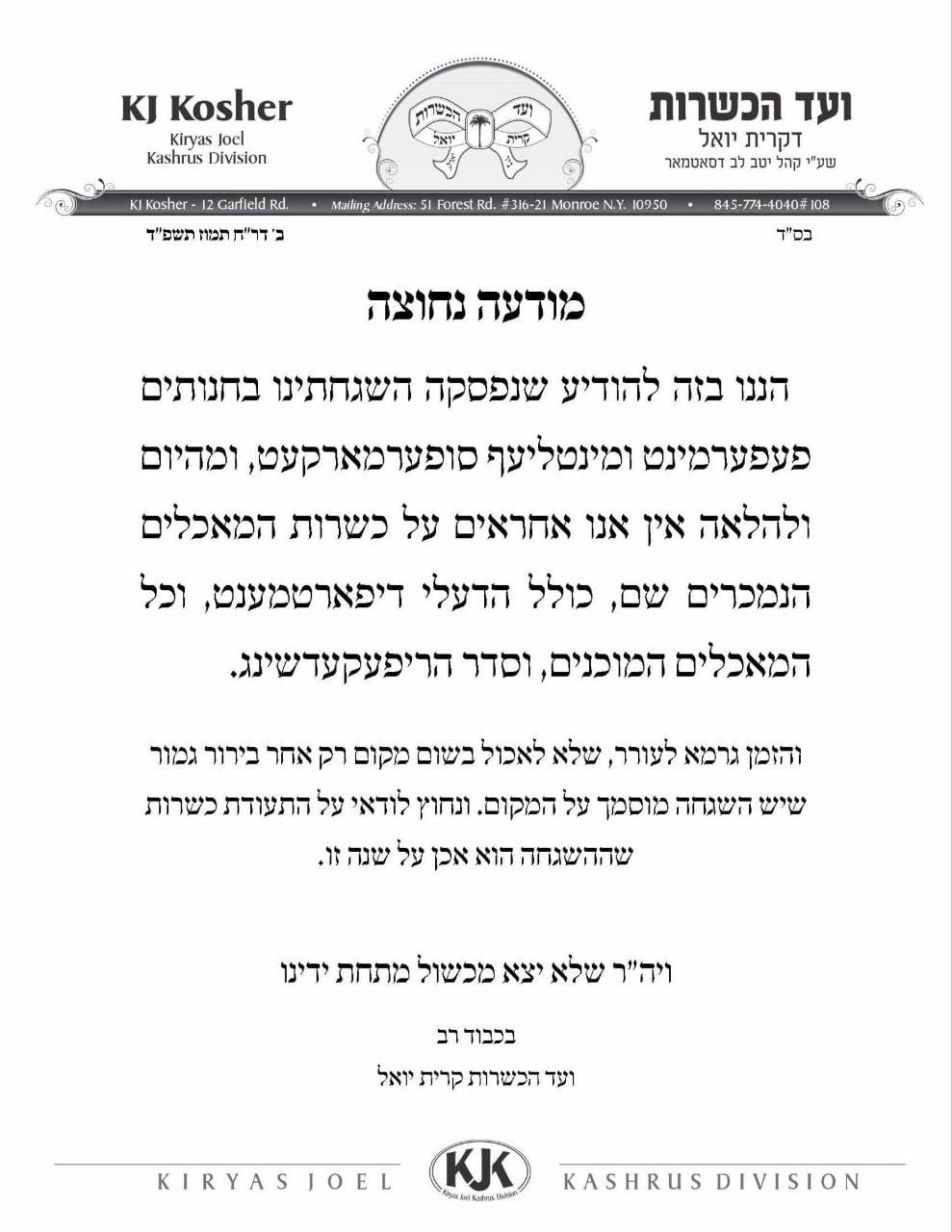 אינטערסאנט אנצימערקן, אז די זעלבע טעראריסטן וואס האבן דא אראפ גענומען די הכשר, טעראזירן איעדע געשעפט אייגענטומער אז ממיז נעמען זייער הכשר, און איעדע איינציגע סטאר און קרית יואל, האט טאקע זייער הכשר, אפילו די גרעסטע זאליס אין בני יואל, פרשת וואלאווע איז א דשאוק אקעגן די טעראריזם און קרית יואל,