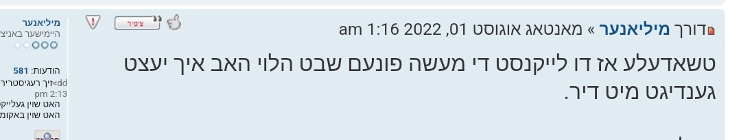 כ'מיין אז ענק גייען דשאסט מוזן טון דעיס וואס די ארונים האבן געטון במשך די לעצטע צוואנציג יאר, און זיך אויפפירן שיין דרך ארץ'דיג און נישט בלאזן ווי קליינע קינדער און זיכער נישט ווארפן קיין פאשקעווילן און מאכן א חילול השם. לאמיר זען צו די זאליס קענען זיך אויך אויפפירן ווי נארמאלע מענטשן.