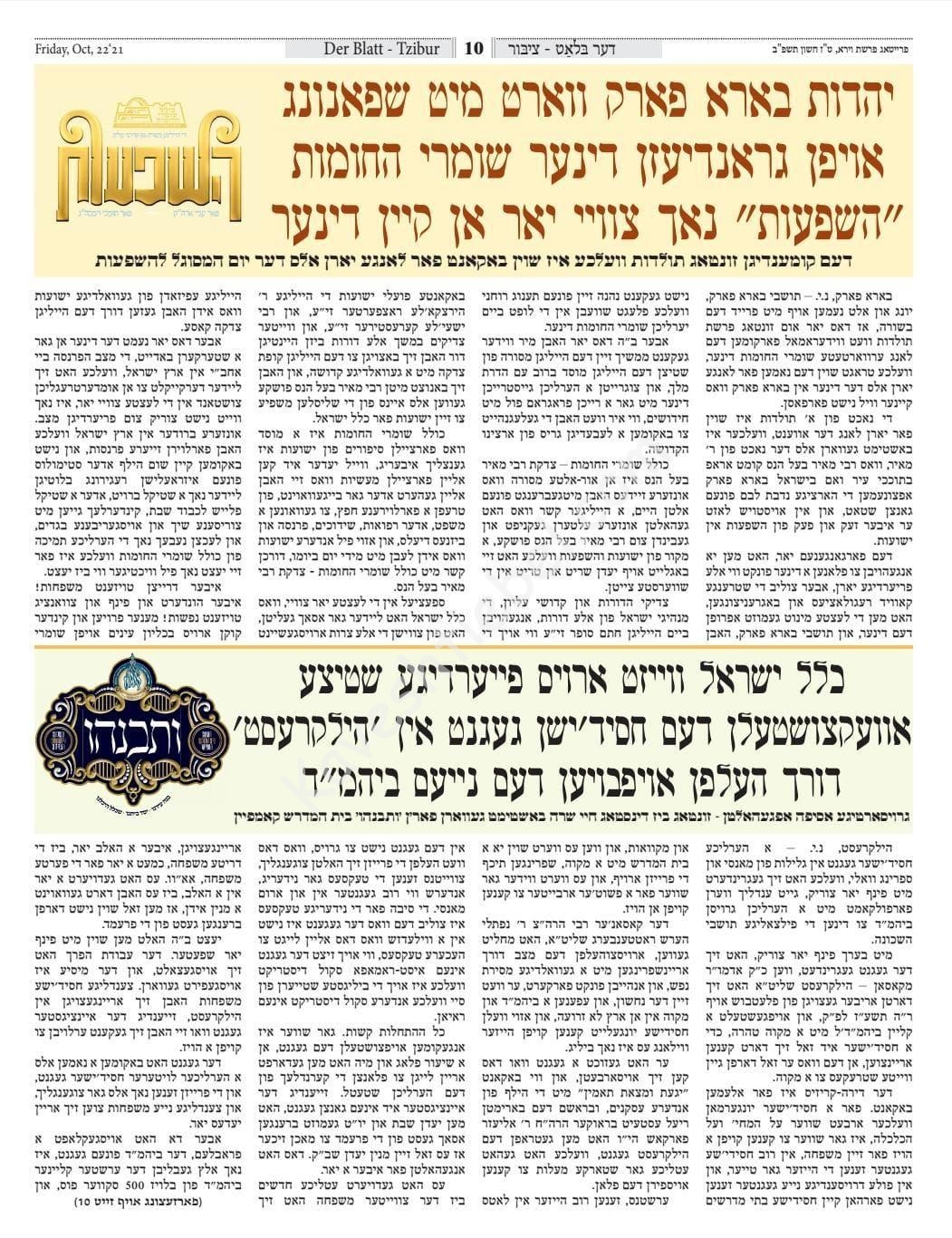בעל דרשן: אויב ער וועט זיין ביי די כוחות. פיזיש און גייסטיג. און נישט זיין (ח"ו) אונטער די ווירקונג פון די אנטי-דיפרעססאנט מעדיצינען. אזוי ווי (ליידער) די פארגאנגענע מאל אום ל"ג בעומר. ביי די מסיבה. וואו די גבאים האבן (נעבעך) איינגענומען גרויסע בושות. ווען דער עולם האט געטאנצן און געזונגען. און די רבי (דער רב) איז געשטאנען (ח"ו) כאבן דומם. נישט געגעבן א שמייכל אדער א פינטל מיט די אויגן. פאר בערך 20 מינוט.ביז די גבאים האבן איהם געגעבן א (איידעלן) שלעפ. אז די מסיבה איז געענדיגט...!
