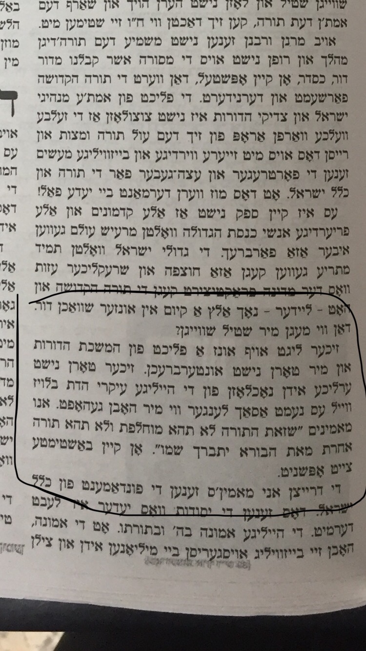 מ'לערענט נישט קיין אמונה, נישט קיין חימוש, נישט קיין שמע ישראל. גארנישט! לית דין ולית דיין. דאס אידישקייט באשטייט צו וויסן ווי גרויס הערצל'ס מחילה איז געווען, און ווי לאנג בעגינס נאניע איז געווען, און ווי גרויס גלדא מאיר'ס דדים זענען געווען, און ווי שטארק משה דיין'ס אויגן האבן געשיינט...און ווי הויך די חרמון איז. דאס באשטייט די אידישקייט וואס מ'לערענט אויס אין די ציוניסטישע פאבליק שולעס,
