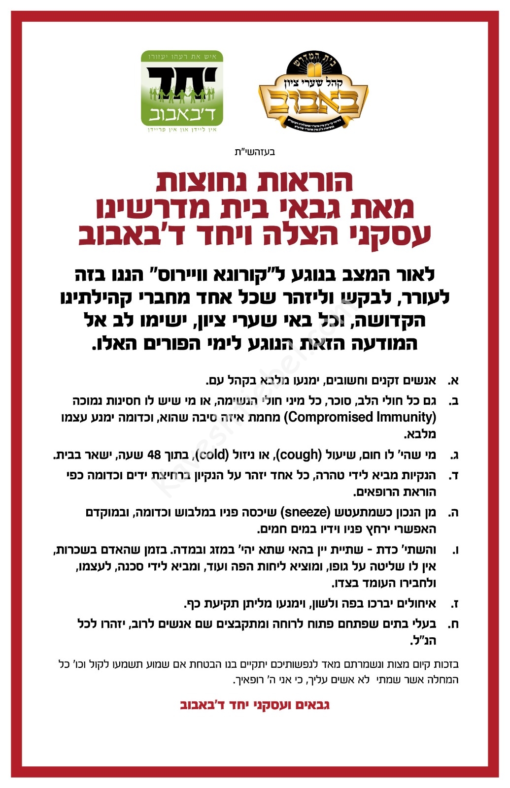 מטעם הגבאים בבית מרן אדמו"ר שליט"א ווערט געמאלדן פאר'ן ציבור אז לעת עתה וועט רבינו מער נישט מקבל זיין קיין געלטער, פדיונות, וכל מיני מתנות עד שיעבור זעם, אלס חשש פון קרונוויירוס וואס כאפט זיך אריין אויף דברים הניתנים מיד ליד.