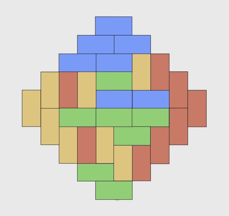 אין דאס אלעס איז דא די געדאנק פון אַן עזטעק דימאנט. דאס איז ווען איך הייב אָן מיט א שאך-ברעט פון 4x4 קעסטעלעך און דערנאך לייג איך ארום דעם קעסטעלעך און איך שנייד אוועק די 4 קעסטעלעך פון די עקן. איינמאל איך האב דאס לייג איך פשוט יעצט ארום איר גבול נאך קעסטעלעך און נאר וואו עס זענען דא קעסטעלעך. אזוי ווערט עס א דימאנט שׁעיפּ. וויפיל מאל איך טוה דעם פראצעדור פון ארומלייגן ארום איר קעסטעלעך און מאכן גרעסער, דאס איז איר אָרדער (די ערשטע איז ווען עס איז א פשוט׳ע 4x4). דאס איז עס ביים פערטן מאל/אָרדער: די עזטעק דימאנט טעארעם לויטעט אז די צאל דאַמינוֺי טיילינגס וואס מ׳קען מאכן דערויף איז 2 געהעכערט צום עקספּאָנענט פון האלב די אָרדער פונעם דימאנט טיימס איינס העכער די אָרדער. עס איז אויך דא דערין די אַרקטיק סירקעל טעארעם וואס לויטעט אז לפי די 4 וועגן הנ״ל א דאַמינוֺי קען טיילן א שאך-ברעט, ווען מען טיילט די דימאנט מיט דאַמינוֺיס ביי רענדאם וועלן די דרויסענדע 4 עקן פונעם דימאנט אלס ווערן ״אריינגעפרוירן״ מיט יעדעס איינע אַן אנדערע פון די 4 וועגן פון טיילינגס (און איך קאליר יעדעס סארט וועג אַן אנדערע קאליר), און אינדערמיט וועט אויסזעהן בערך ווי א סירקעל. ווי העכער די אָרדער פונעם דימאנט ווערט, אלס מער וועט די אינדערמיט אויסזעהן ווי א סירקעל. כזה: די צאל וועגן ווי אזוי צו טיילן דעם דימאנט איז 2 צו די פּאַוּער פון די אָרדער וואס עס איז.
