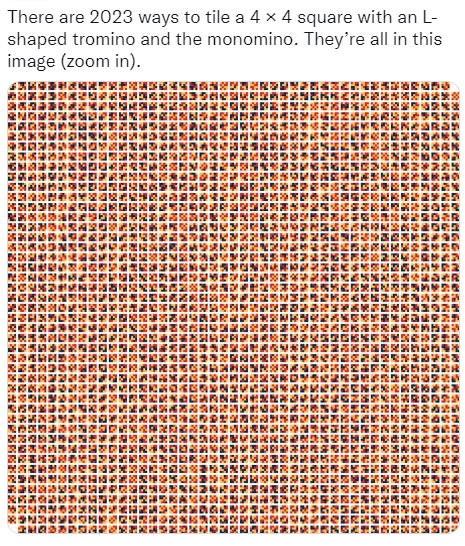 לכבוד די ניי יאר האט דער מאטעמאטיקער דר. עד סאַוּטהאָל ארויפגעשטעלט אז עס זענען פארהאן 2,023 וועגן פון (פונקטליך און גענצליך) טיילן א 4x4 סקווער מיט טראַמינוׂיס (וויפיל מ'וויל) אינעם שׁעיפּ פון אַן L און מאַנאַמינוׂיס (וויפיל מען וויל):