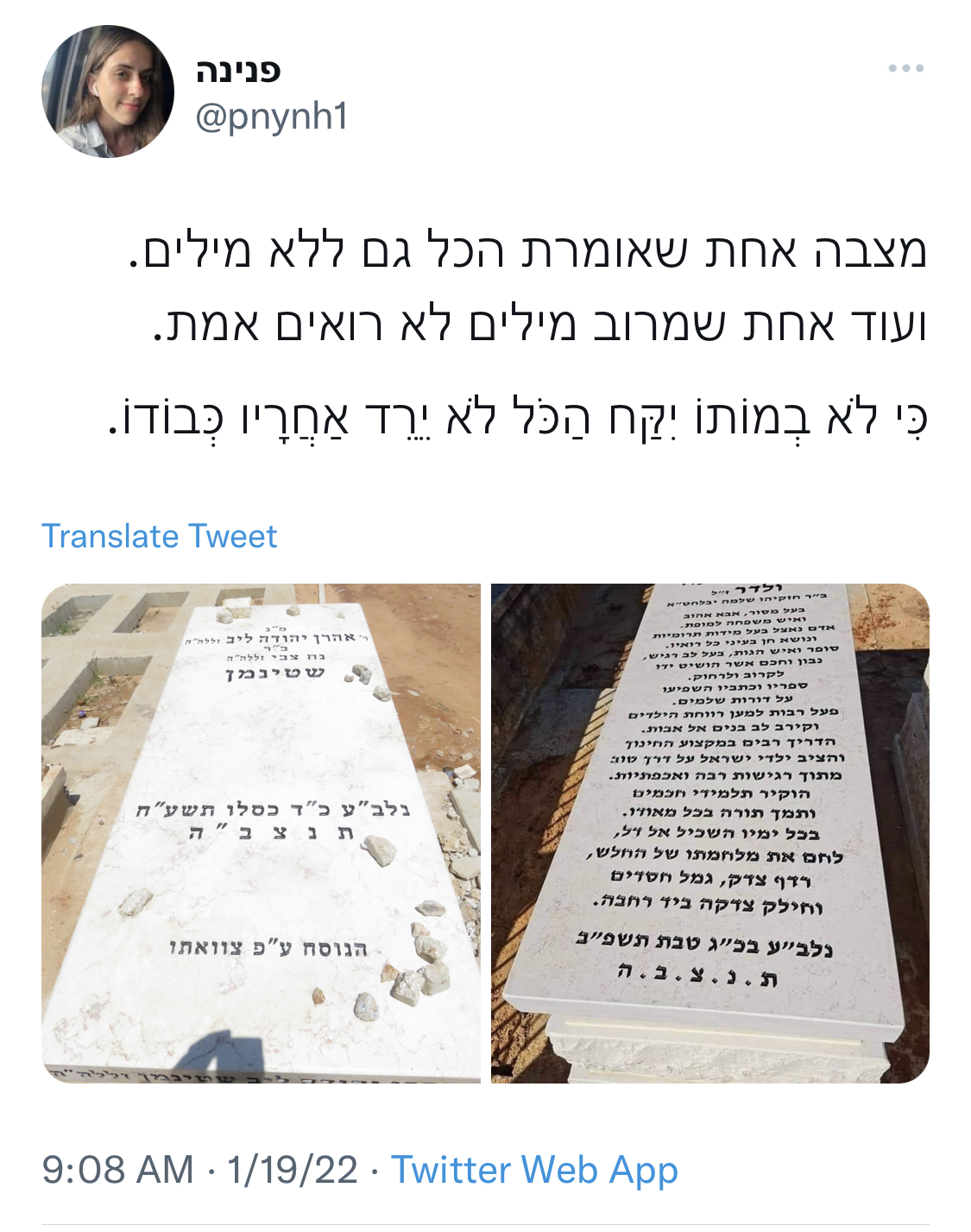 הע?מאך זיכער האט געשריבן:עס זעט מיר אויס ווי ביי די ליטווישע אין בני ברק איז נאך דא דער מושג פון געהעריג איגנארירן אן ערד ציטערניש. ביי די חסידים אין אמעריקע וואלט דאס קיינמאל נישט געקענט פאסירן, נישט אזא שיינע מציבה.