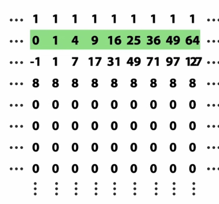א נומער וואנט העלפט מיט׳ן קענען דעצידירן וואס קומט דערנאך אין א סיִקווענס וואס מ׳געבט דיר. והיינו, איך שטעל אט די סיִקווענס אונטער די שורה פון 1׳ס. ביי א געוואלד סיִקווענסעס וואס גייען מיט עפעס א סדר וועט די נומער וואנט זיך עווענטועל ענדיגן מיט נאר שורות פון 0,ס. למשל, דא ביי די סיִקווענס פון סקווערס: דאס האלט אויך אָן ביי די סיִקווענס פון קיוּבּס, העכערע פּאַוּערס/עקספּאָנענטס, ואפילו די פיבּאָנאַטשי סיִקווענס.