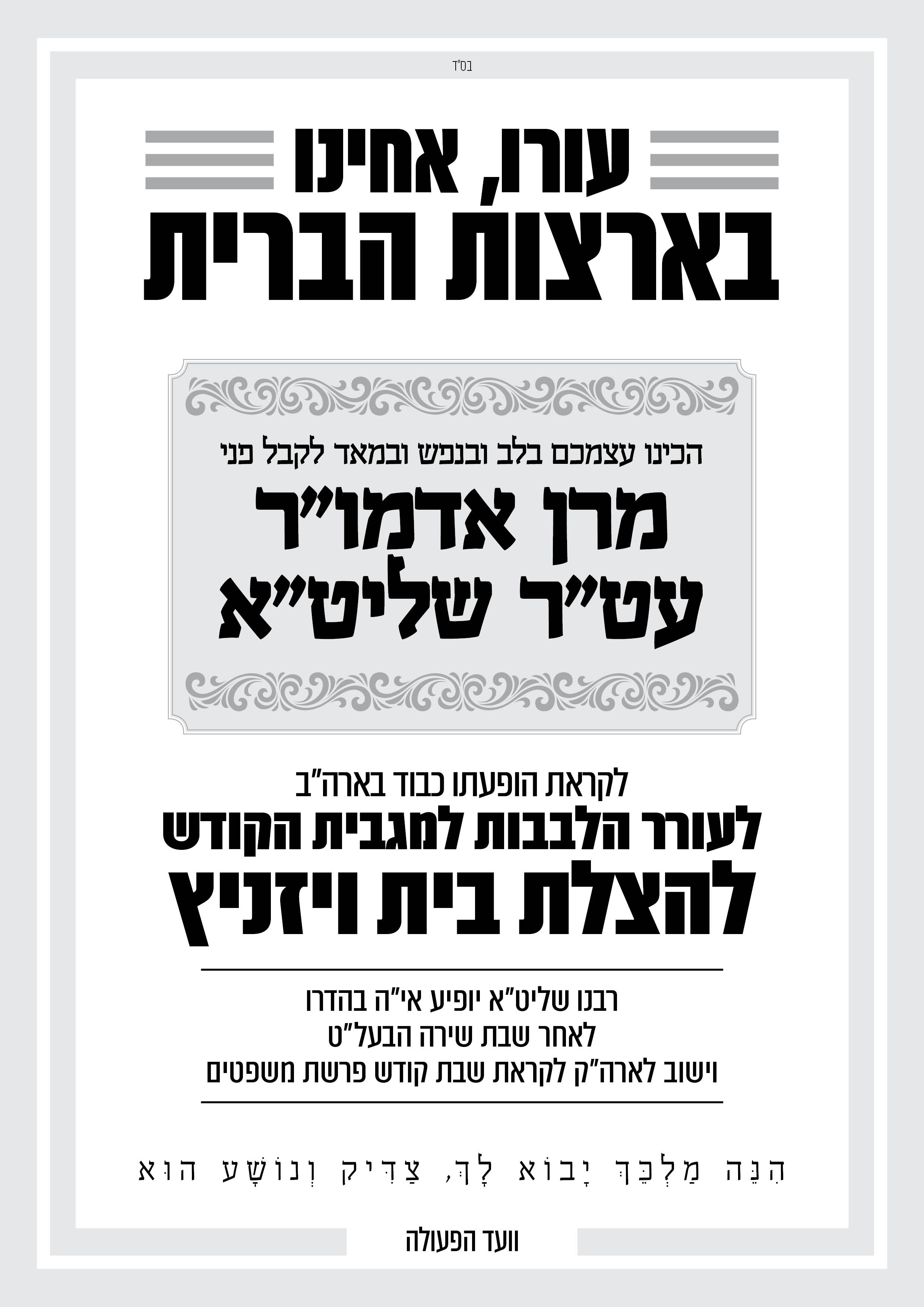 אדמו''ר מ'וויזניץ פארופט אן אסיפה פאר אלע חסידישע אידן פון ב''ב